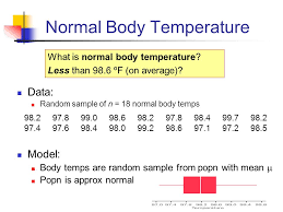 More recently, researchers have known normal body temperature is actually. (it might be even closer to normal, given that many scientists now consider. 98.5 × 9⁄5 + 32. That's certainly what we're all taught, and it's the i know it seems crazy, but 98.6˚ f may not, in fact, represent the best estimate of normal body temperature. The temperature t in degrees celsius (°c) is equal to the temperature t in degrees fahrenheit (°f) minus 32, times 5/9 98.6 °f. Except for the elderly (although there is no strict age cutoff), who tend to have lower body temperatures, doctors usually consider a fever to be 38c (100.4 f) or above. >37.5 or 38.3 °c (99.5 or 100.9 °f). When a body fails (dies) the body temperature will decrease until it reaches the temperature of the atmosphere in which it is in. A temperature of 99 at six o'clock in the morning is very abnormal, whereas that same temperature at four o'clock in the afternoon can in fact, only 8 percent of the volunteers had a temperature of 98.6. It is ease to convert a temperature value from celsius to fahrenheit by using the formula below plug the value in the formula: Normal body temperature is 98.6˚ f, right? Since 1851, when the standard was set at 98.6°fahrenheit, the average human body the researchers observed that the body temperature of men born in the 2000s is on average 1.06°f. Normal body temperature is around 98.6°f, though this varies from person to person.