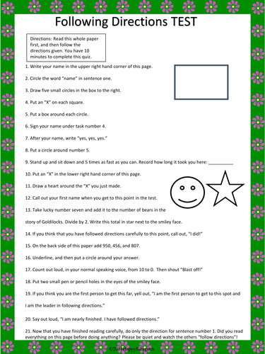 TheHappyTeacher from 1.bp.blogspot.com To take this test, all you need is a pen or pencil, an 8 1/2 by 11 piece of paper, and a watch or clock for timing yourself. We are going to do an activity which requires you to carefully listen to my directions. An active listening and following directions game. Bend your arm, look at the floor, then laugh. I will only say each direction once and it is your job to follow it. What's the best way to practice following directions? If you have read this so far, pretend that you are still writing. After you take the test, check the bottom of this page to see how well.